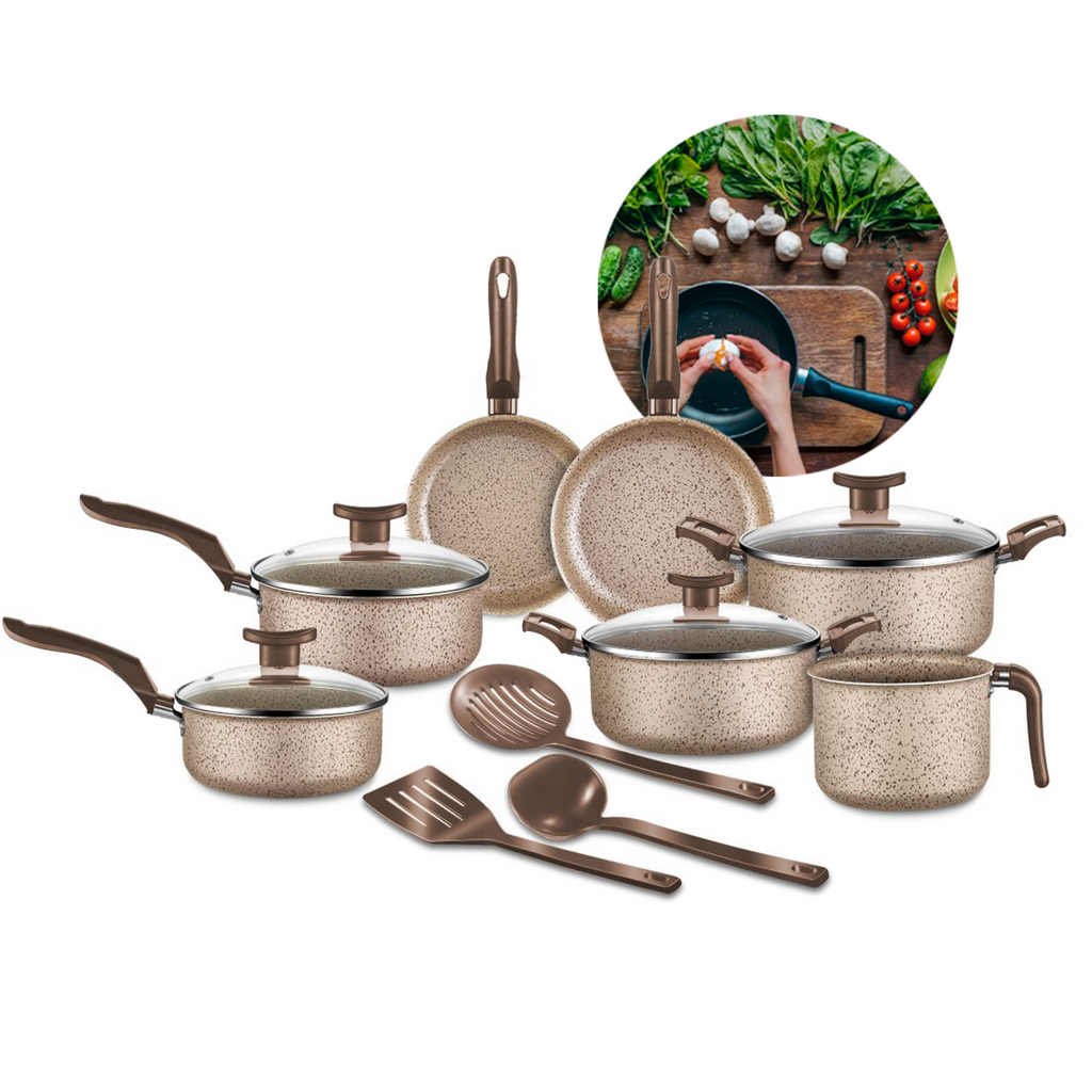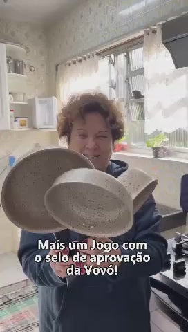 Fáceis de limpar, pois o antiaderente impede que os alimentos grudem. Utilizáveis em fogão a gás e compatíveis com máquina de lavar louças.