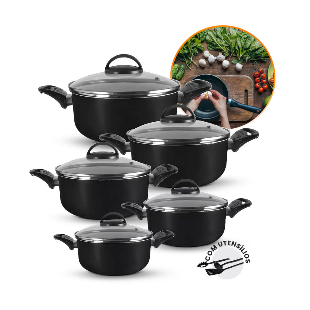 O Jogo de Caçarolas com Utensílios é perfeito para equipar sua cozinha com itens essenciais e modernos, oferecendo um ótimo custo-benefício. Suas peças antiaderentes são fáceis de limpar e resistem a riscos, unindo funcionalidade e design elegante.